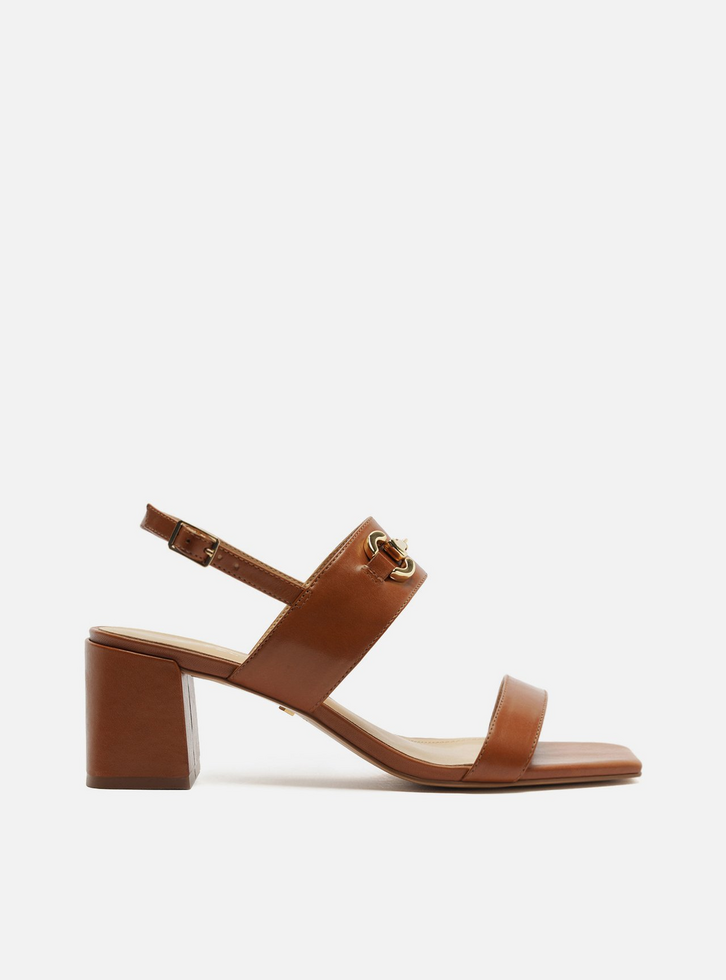 Sandália marrom de couro. O sapato tem salto médio bloco e formato quadrado na ponta. Traz tira larga sobre os dedos e tira na parte superior do pé, com aplicação de bridão metálico dourado, conectada à tira afivelada no calcanhar. Com palmilha bege e inscrição do nome da marca.